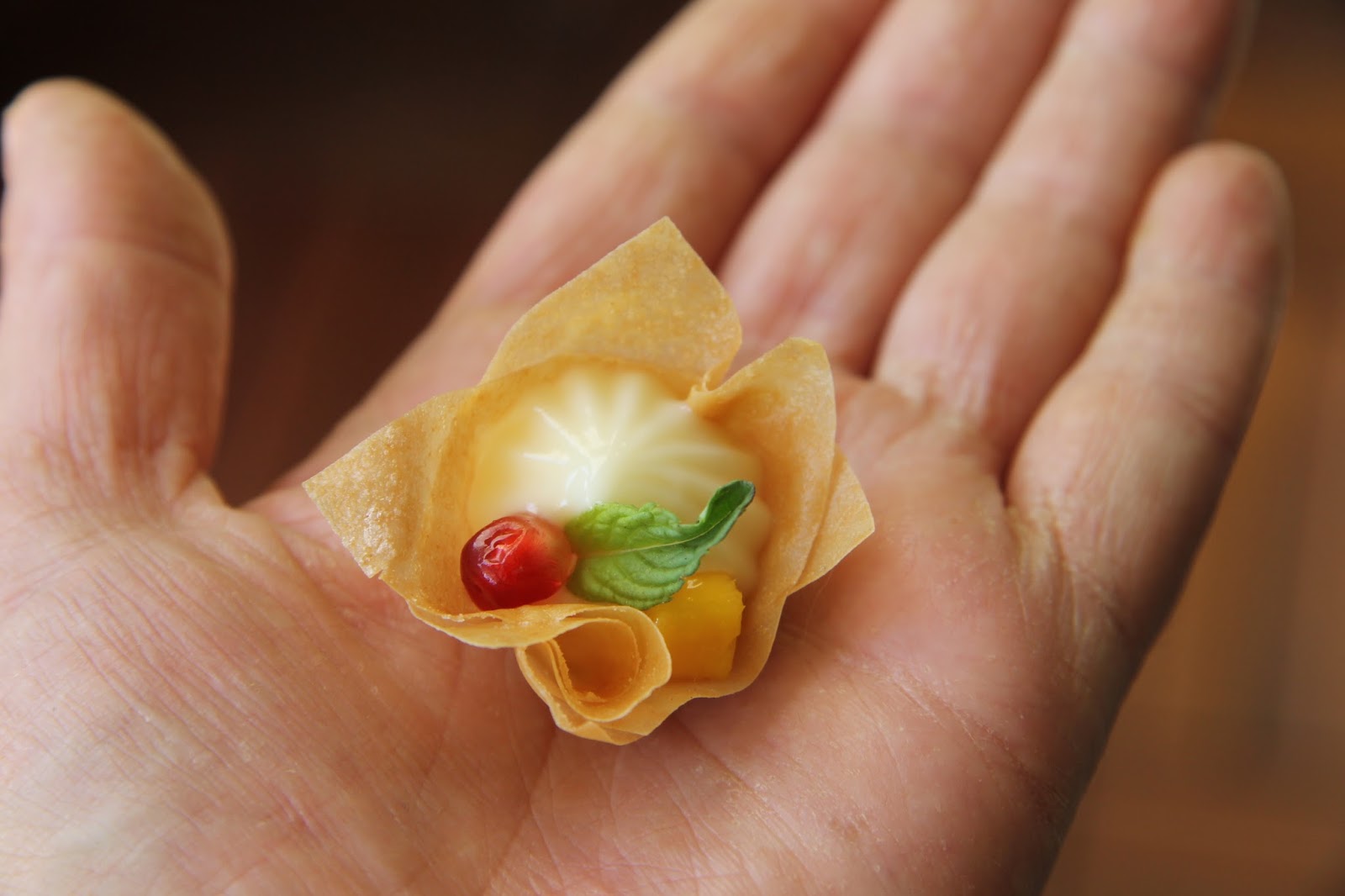 מזלפים קרם לתוך קונכית, מוסיפים קובית קטנטנה של מנגו, רימון ונענע